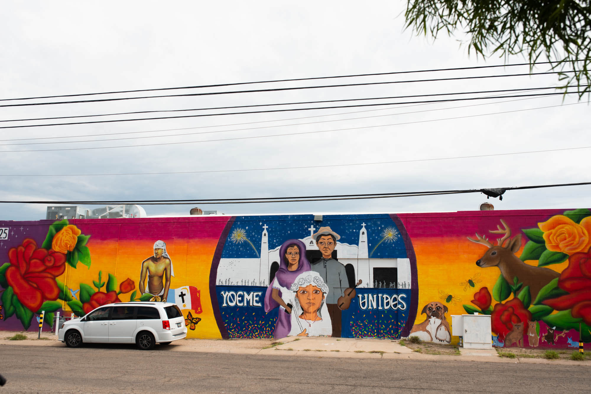 The mural, Yoeme Unidos, was painted by two local artists, Anitra “Yukue” Molina, and Ignacio Garcia, along with seven Yaqui youth artists, aged 9–16. The kids were the main drivers of the mural’s content, which features elements of the desert environment, Yaqui Easter celebration, and the importance of family and women as the backbone of the community.